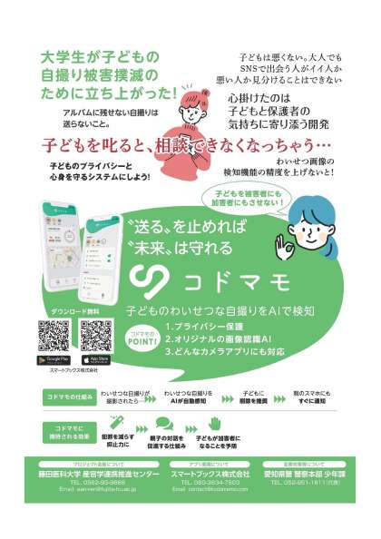 自画撮り被害防止アプリ「コドマモ」について、愛知県警より案内がありました。