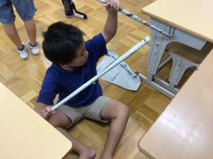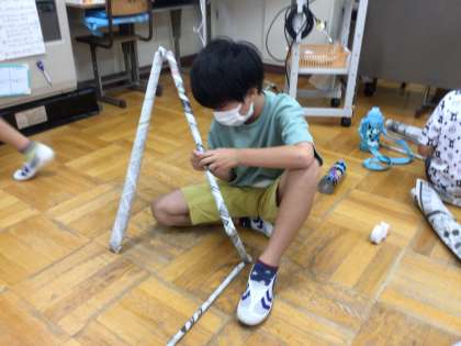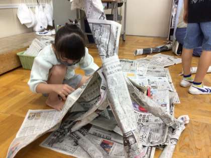 新聞紙を使って、テントやのれんを作っています。くるくる丸めて自由に組み合わせています。