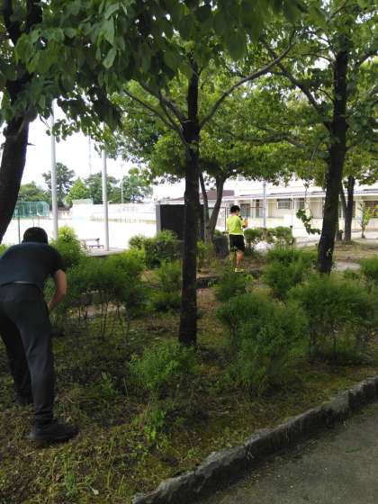 校舎前の植え込みのトリミングと校門坂の除草作業を行いました。