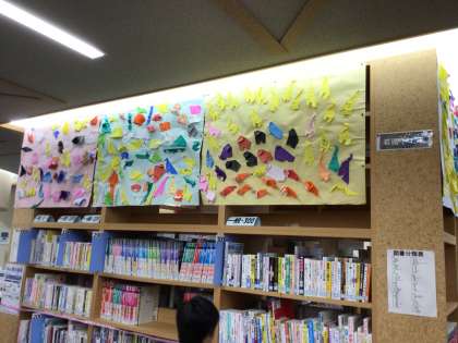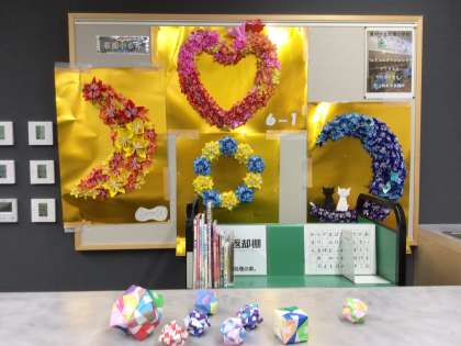 折り紙作品が華やかで素敵です。お家の人が見に来ていました。中学生がボランティアとしてお手伝いをしたり、吹奏楽部の中学生が演奏したりしていました。12:15頃から体育館で、若園小学校6年生有志による合唱の発表があります!