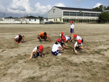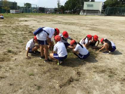 5年生が運動場の草取りをしてくれています。 1年生は秋の虫探しです。