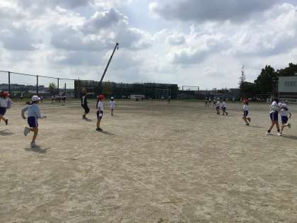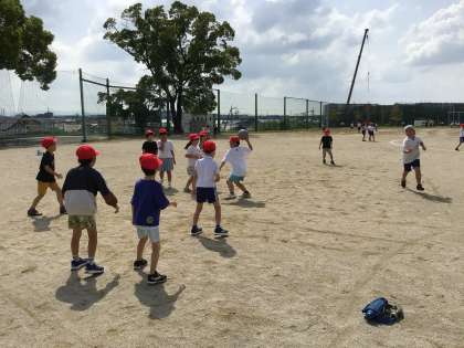 ドッジボールや鬼ごっこで楽しく過ごしています。担任の先生や学生さんも一緒です。