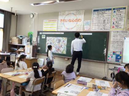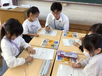 実習生さんの研究授業です。グループで協力して、地図から見つけたことをまとめたり、発表したりしました。