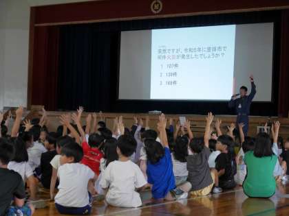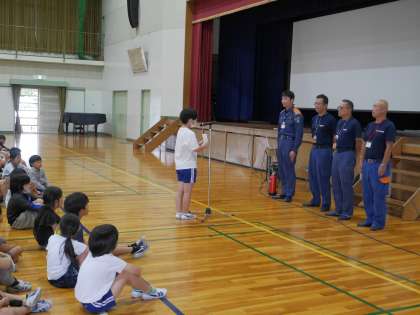 予防課の方からのお話を聞き、児童代表がお礼の言葉を伝えました。