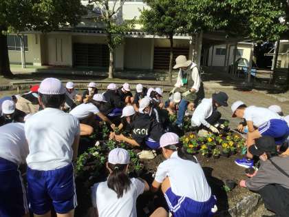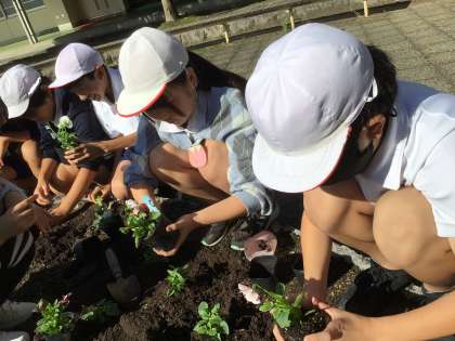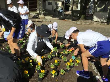 6年生児童が考えたデザインのもと、若小クローバーのボランティアさんと6-4の子どもたちで円形花壇にパンジーの苗を植えました。春にはきれいな花がたくさん咲きます。楽しみですね。