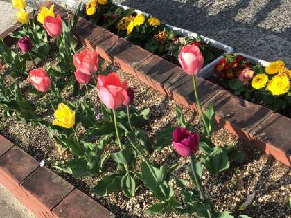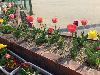 若小クローバーのボランティアの方々が植えたチューリップです。入学式に満開となりました。