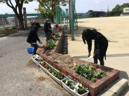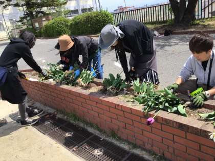 地域学校共働本部のボランティアのみなさんに花壇の整備をしていただきました。
