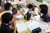 新聞の作成に向けて、グループで内容やタイトルについて楽しそうに話し合っていました...