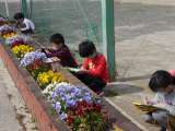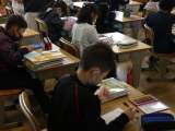 一心に自己紹介カードを書く子どもたち。お互いのことをよく知って、なかよく1年を過...