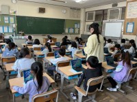 タブレットの使い方について先生から説明を聞きます。大切に使おうね。