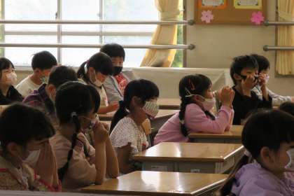 今年度、初回の「そらまめくん」の読み語りです。スピーカーから流れるお話に、1年生もじっと耳を傾けています。
