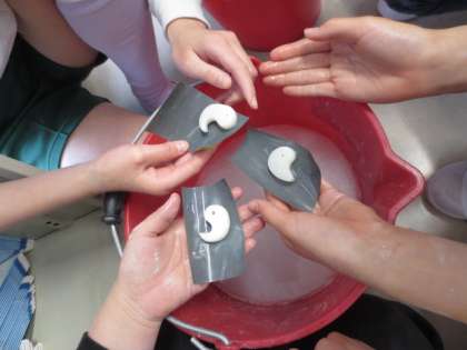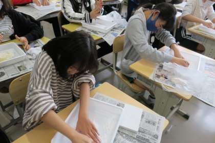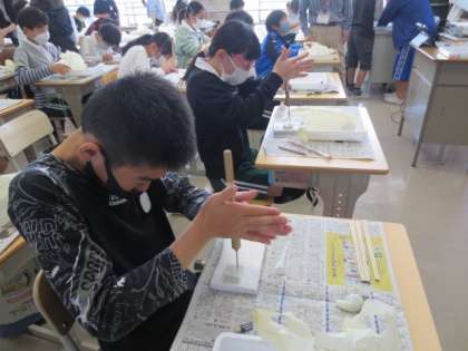 6年社会科出前授業のようすです。豊田市郷土資料館から講師を招いて、火起こしや勾玉づくりを体験しました。