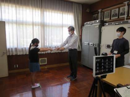 児童委員会の委員長の認証式を行いました。一昨年度までは全校集会で行っていましたが、今回はZoomを使って校長室からオンラインで行いました。全教室とつなぐのは初めての試みでしたが、昨日からのリハーサルのおかげで上手くいきました。今後も活用を広げていきたいと思います。