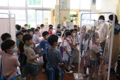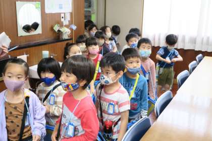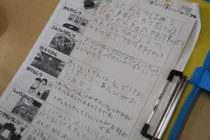 1年生が生活科で「がっこうたんけん」をしました。学校にはいろいろな教室や部屋があり、たくさんの人が働いていることを調べていきます。校長室では、歴代校長の写真が18枚あることや途中で白黒からカラーになっていることを発見しました。