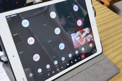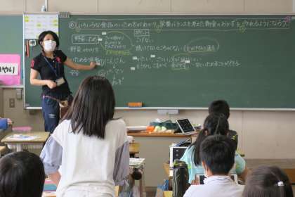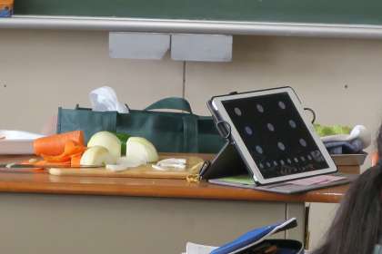 6年家庭科の授業です。食品のいため方を学習しています。今は実習ができないので、先生の実演をタブレットで見ています。お家で作ってあげてください。
