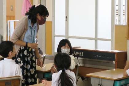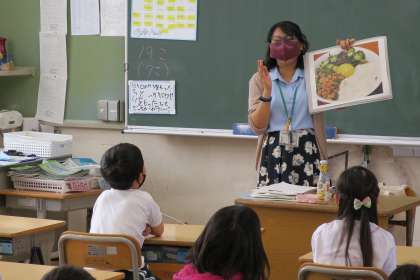 外国語活動の授業は3年からですが、1,2年にも国際理解を深めるためにALTが入った授業を行っています。「ハロー」と次の子にあいさつのリレーをしていました。初めてだけどどうだったと聞くと、「楽しかった」と笑顔で答えてくれました。