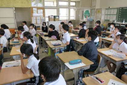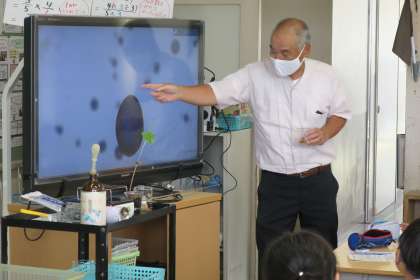 6年理科の授業です。ジャガイモのでんぷんの観察をしています。緊急事態宣言が出ていなければ、理科室で子どもたちが顕微鏡を使って観察をします。今日は教室で先生が顕微鏡にカメラを接続し、大型モニターに映しています。そこにヨウ素液をかけて、でんぷんが青むらさき色になることを、ライブで確認しました。