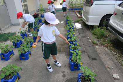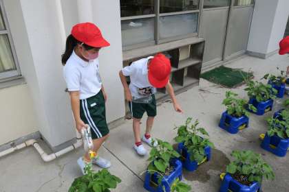 1年生のアサガオが大きくなってきました。のびたつるを持ち上げて見せてくれました。「もう、棒をさしたほうがいいよ」と支柱を立てることを考えているようです。もうそろそろですね。