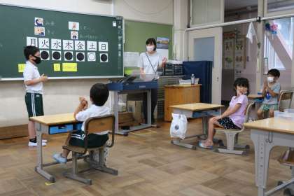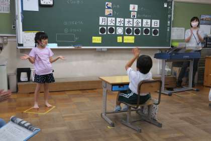 8組音楽科の研究授業です。7拍を月曜日から日曜日にあてて、リズム打ちをします。「水曜日は○○なので、お休みにする」と、休符の位置を決めて、リズムがそろうように打っていきます。さらに、休符の代わりにひざをたたくなどの動作が加わり、時間いっぱい楽しく活動することができました。