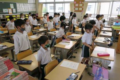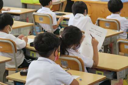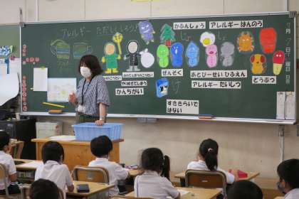 1年生が養護教諭といっしょにアレルギーについて学習しています。その原因や症状を知るとともに、アレルギー反応を防ぐために、原因となるものを避けたり食べないようにしたりしている人もいることを理解しました。
