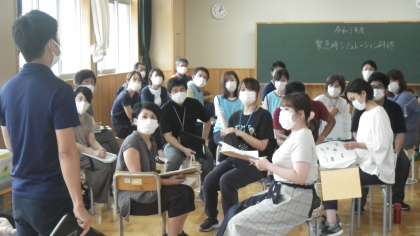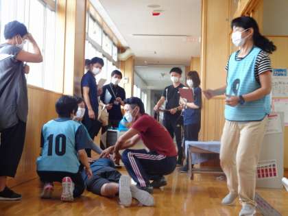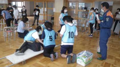 緊急時対応シミュレーション研修 公開日 2021/08/26 更新日 2021/08/26 校長室から 中消防署から講師を派遣していただき、緊急時対応シミュレーション研修を行いました。「熱中症」「食物アレルギー」「頭部打撲」について現場を再現し、対応の仕方を確認しました。