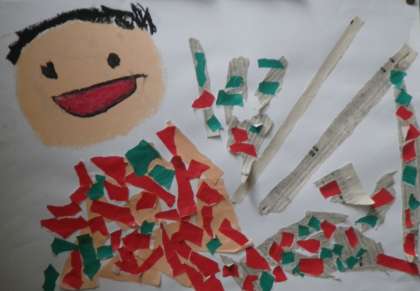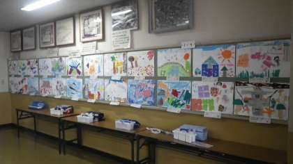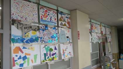 1年の通路には、クレパスと色紙で描いた絵が掲示してあります。大胆な構図と色使いで、子どもたちならではの作品です。