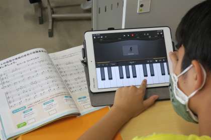 GarageBand 公開日 2021/09/14 更新日 2021/09/14 校長室から 6年生が、楽器アプリの鍵盤を演奏して実技テストを行っていました。鍵盤ハーモニカの代わりに、音楽の授業でよく使われています。