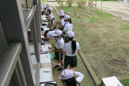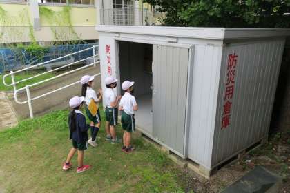 4年生が、防災用倉庫について調べています。中にはたくさんのダンボール箱がありました。箱には何が入っているのでしょう。