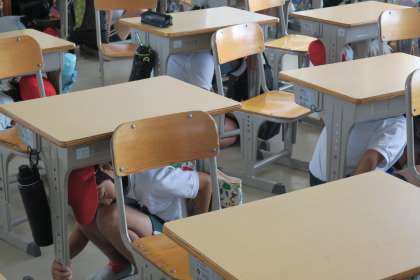 地震速報と同時にシェイクアウト訓練に入ります。机の下にもぐって机の脚を持ち、頭を守り、揺れが収まるまで動きません。その後、運動場に避難をして人員の確認をします。