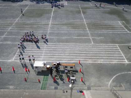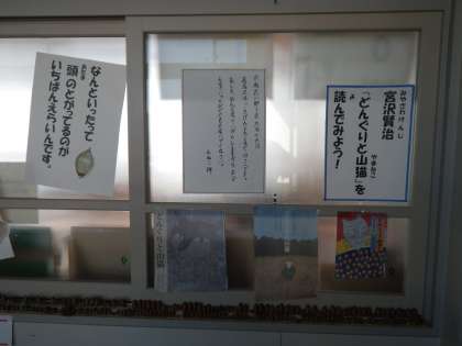 図書館に宮沢賢治の『どんぐりと山猫』のコーナができていました。そこには子どもたちが集めてきたドングリもいっぱい並んでいます。図書館の窓から運動場を眺めてみました。明日は運動会です。