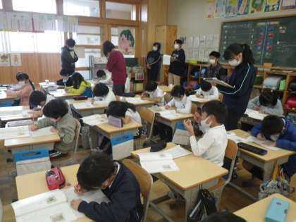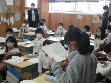 2年国語科の研究授業です。「お手紙」という話で、がまくんとかえるくんの気持ちを想像します。手紙を待っている2人がしあわせな気持ちでいる理由を、友だちの意見をよく聞いて、自分の言葉でしっかりと発表していました。