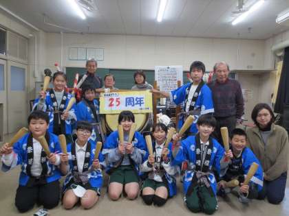 25周年 公開日 2021/12/07 更新日 2021/12/07 校長室から 山中太鼓豊田支部の方々が、和太鼓クラブを指導して25年になるそうです。法被を着て叩くと、雰囲気も上がります。法被姿で記念写真を撮りました。