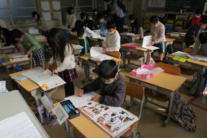 1年生が動物図鑑を使って調べ方の学習をしていました。インターネットを使ってピンポイントで調べることもできますが、図書だとそこにたどり着くまでに、いろいろなことに目が留まります。新たな出会いや発見があるのが図書の魅力です。