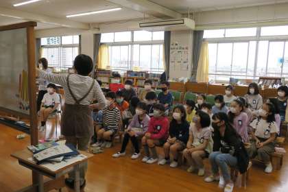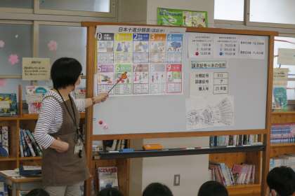 5年国語の授業です。図書館に置かれているさまざまな種類の本や資料について、図書館司書に説明してもらっています。図書館の本は、日本十進分類法(NDC)によって分けられ、整理されています。