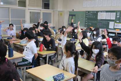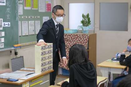 6年生が税務署から講師を招き、租税教室を行っています。税金がなくなったらどのような社会になるのかを知り、税金のはたらきについて学習しました。そのなかで、1億円(みほん)を見せてもらいました。重さは約10キログラムだそうです。