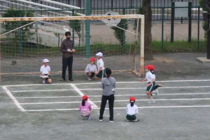 6年の教室から運動場を見ました。くもり空の下、2年生が体力テストの50m走の測定をしています。