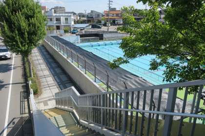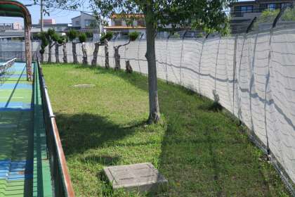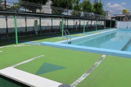 登校時前から16名の作業員の方々が支柱に遮光ネットを張ってくださり、プールサイドに日除けが完成しました。合わせて、プール周りに目隠しネットも張っていただきました。