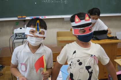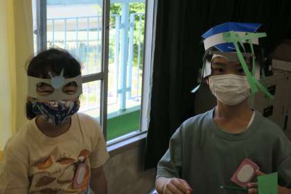 2年図画工作科の授業です。作品を身に付けて見せてくれました。