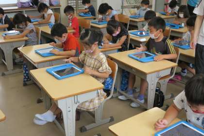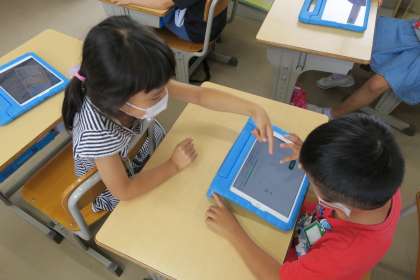 Qubena(キュビナ) 公開日 2022/07/06 更新日 2022/07/06 校長室から 1年生が、デジタルドリル教材(AI型教材Qubena)の使い方を練習しています。手書きで入力して、それをAIが認識してから解答ボタンをタップするという手順に、少し戸惑っていましたが、すぐに慣れました。正解の「まる」とチャイムに、ガッツポーズをしていました。