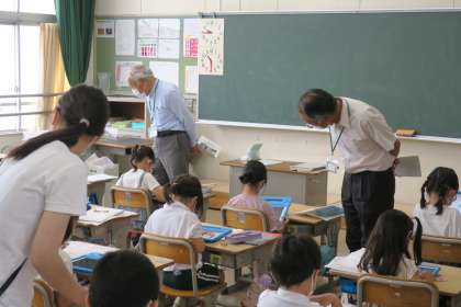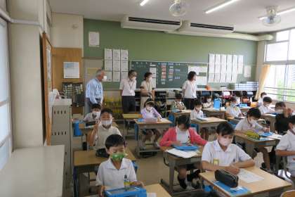 学校アドバイザー 公開日 2022/07/07 更新日 2022/07/07 校長室から 学校アドバイザー会を開催し、アドバイザーの方々に学校の様子を見ていただきました。子どもたちが落ち着いて学習に取り組んでおり、感染症や熱中症対策をする中、先生方の知恵と工夫で乗り越えていく姿が、子どもたちに生きる力を与えることになっているという言葉をいただき、大きな励みとなりました。