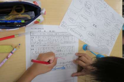 4年理科の研究授業です。空気は力を加えると体積はどうなるかを調べます。「風船は力を加えると横に広がるから、体積は変わらない」「ボールを蹴るとへこむから、体積は小さくなる」など、理由を付けて予想ができていることろが大変よかったです。これは本時の前に、空気を意識するための活動を行い、空気のイメージを明確にもたせたからだと思います。