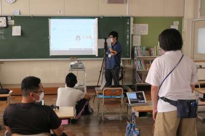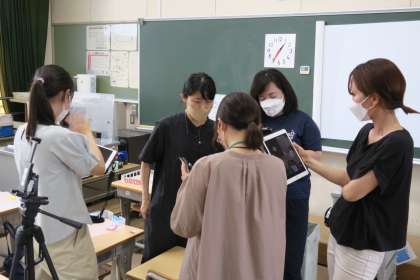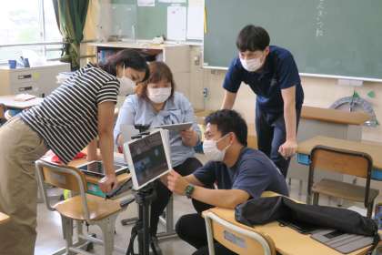 オンライン授業の研修 公開日 2022/09/01 更新日 2022/09/01 校長室から 午後から、オンライン授業の実施するための研修を行いました。タブレットを三脚に固定するのに悪戦苦闘するなど、実際にやってみるとできること、できないこと、いろいろと分かってきます。