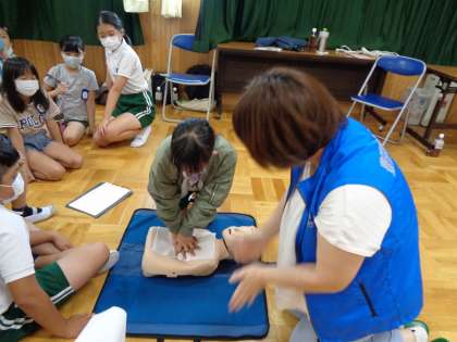 5年応急手当講習(9.27) 公開日 2022/09/27 更新日 2022/09/27 各学年から 消防署員とインストラクターの方から胸骨圧迫の方法やAEDの使い方を教えていただきました。どの子も真剣に話を聞き、訓練に取り組むことができました。