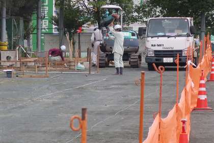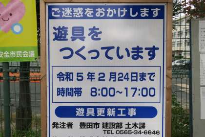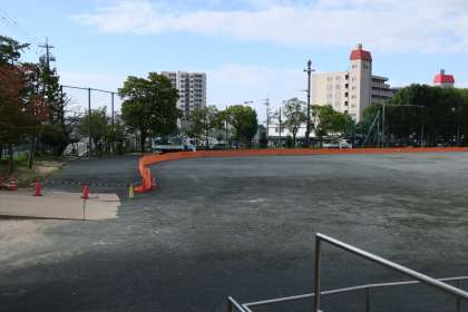 これまであった遊具はすべて撤去され、新しい遊具の設置工事が始まっています。工事エリアを確保するためにフェンスが張られ、運動場がさらに狭くなっています。工事終了まではご不便をおかけしますが、よろしくお願いします。