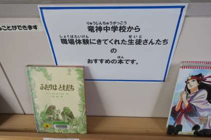 竜神中学校の4名の2年生が、本校で職場体験を行っています。今日は図書館司書と図書館の仕事を体験し、おすすめの本の紹介をしました。