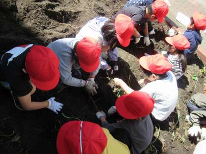 1年 生活科いもほり(10.11) 公開日 2022/10/11 更新日 2022/10/11 各学年から 春に植えたサツマイモのいもほりをしました。大きさは小さめでしたが、楽しそうにサツマイモをさがしていました いもほりに合わせて、杉の子サポーターさんが来てくださり、リース用にツルの巻き付けをしてくださいました。ありがとうございました。 今後、リースの飾りつけの授業を予定しています。どんな作品ができるのか楽しみです。
