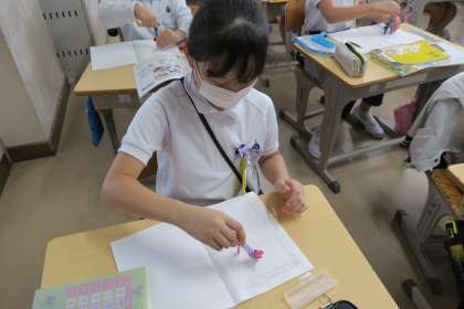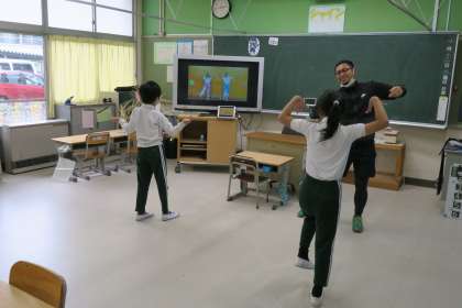 5時間目の授業です。3年生はコンパスの使い方を、7組はダンスを大型モニターの動画を視聴しながら学習していました。
