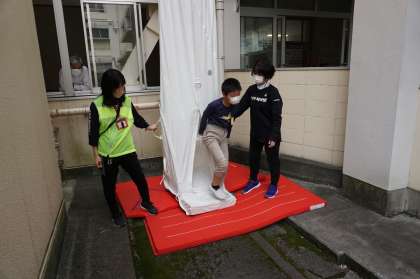 消防署員の指導のもと、救助袋で3階から1階に避難する訓練をしました。