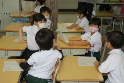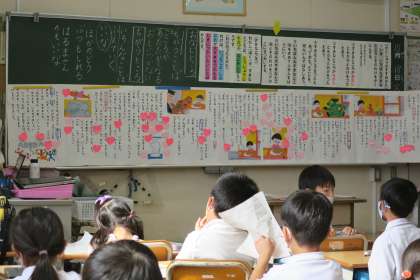 1年国語科の研究授業です。友達との意見交流を通して、物語の一番好きなところ(場面)を決めます。同じところであっても好きな理由が違ったり、違ったところでも理由は同じであったりすることを互いに知り、再度一番好きなところを考えます。「やっぱり」○○のところと、好きな理由について思いを深めることができました。