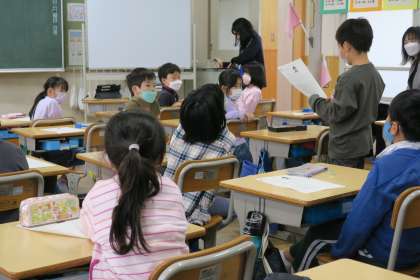 式が2つ 公開日 2022/11/28 更新日 2022/11/28 校長室から 2年算数の研究授業です。かけ算で求めた値に数を足したり引いたりして答えを求める問題に取り組みました。「積む」は「(高さが)増える」、「食べる」は「(個数が)減る」と、動作や行為が「なに算」になるかを考えて、2つの式から答えを導き出しました。発言をしている人をしっかりと見て、理解しようと聞いているところが素晴らしいです。「順番にやっていけば、式が増えてもできそう」と自信を深めることができたようです。
